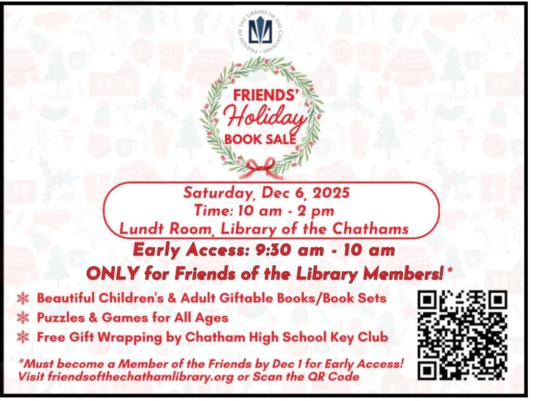 The Friends of the Library is a 501(c)3 non-profit organization run by volunteers. Friends are residents of The Chathams who are advocates of the library. After expenses, 100% of the money raised goes back into the library to help finance materials, services, programs, and improvements that are not covered in the regular library budget.
